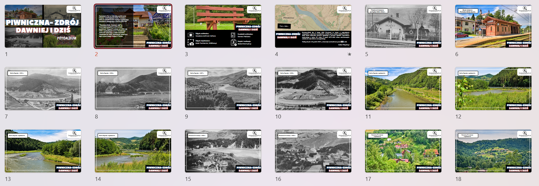 ”Piwniczna-Zdrój-Dawniej i dziś” to fascynujące połączenie archiwalnych pocztówek i fotografii z okresu od 1908 r. do 1939 r. pochodzących m.in. z Narodowego Archiwum Cyfrowego, a także autorskich, współczesnych zdjęć, ukazujących przemiany tego malowniczego miejsca w Polsce.